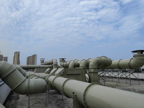 實驗操作室廢氣釋放 → 抗逆性炭過濾系統器 → 引真空風機 → 釋放